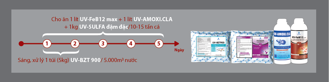 Lưu ý: Giảm lượng thức ăn còn 0.5-1% trọng lượng đàn cá, để tăng hiệu quả điều trị.