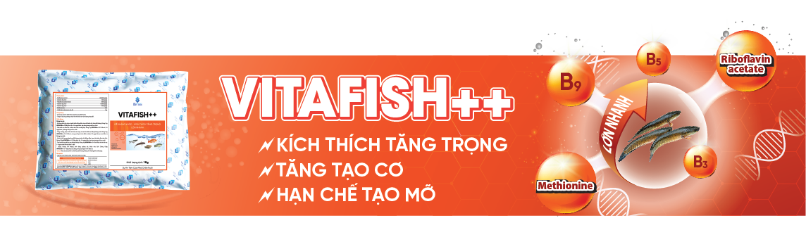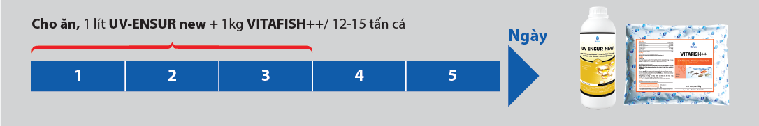 *Lưu ý:  Kích thích cá lớn nhanh, nặng cơ thịt, cho ăn 1 lít UV-ENSUR new + 1kg VITAFISH++ /10-12 tấn cá, cho ăn liên tục 5 ngày trước khi xuất bán 1 tuần.