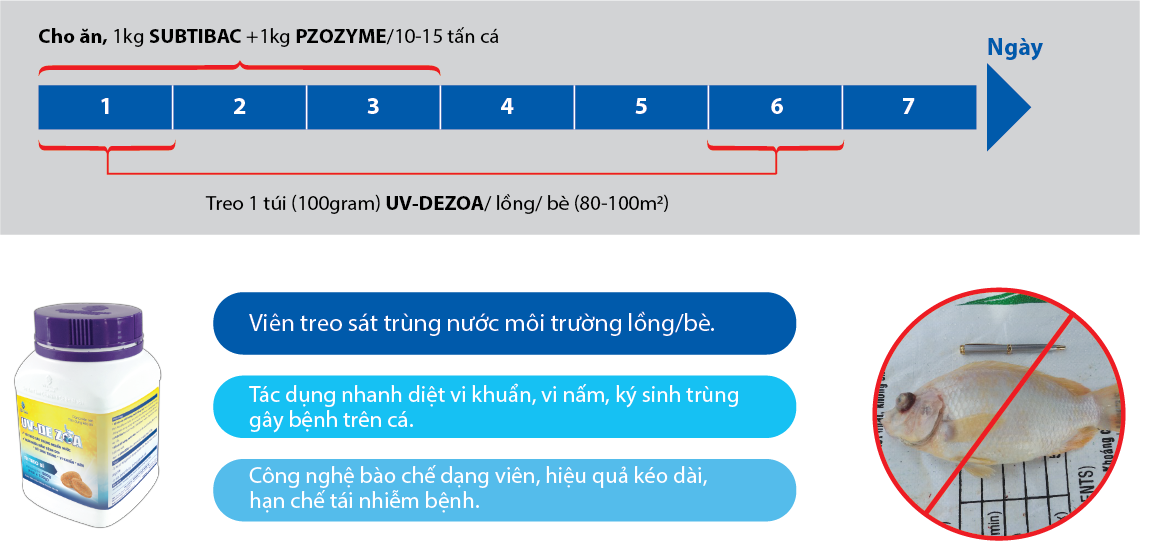 Bổ sung chủng lợi khuẩn Bacillus đối kháng khuẩn gây bệnh xuất huyết lồi mắt, bầm mang trên cá điêu hồng. Hình thành lớp màng bảo vệ ngay tại đường ruột cá. Đồng thời tăng cường hệ miễn dịch cho cá, giúp cá phòng ngừa bệnh tật tối ưu.