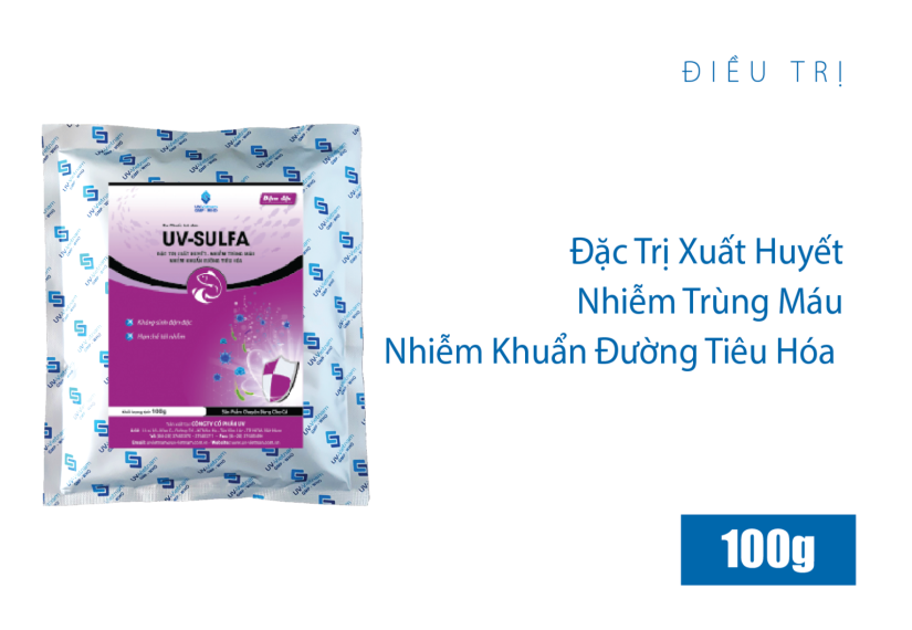 - Phòng bệnh: Dùng 1kg UV-SULFA/30 tấn vật nuôi hoặc 5-7g/kg thức ăn, cho ăn liên tục 2-3 ngày.